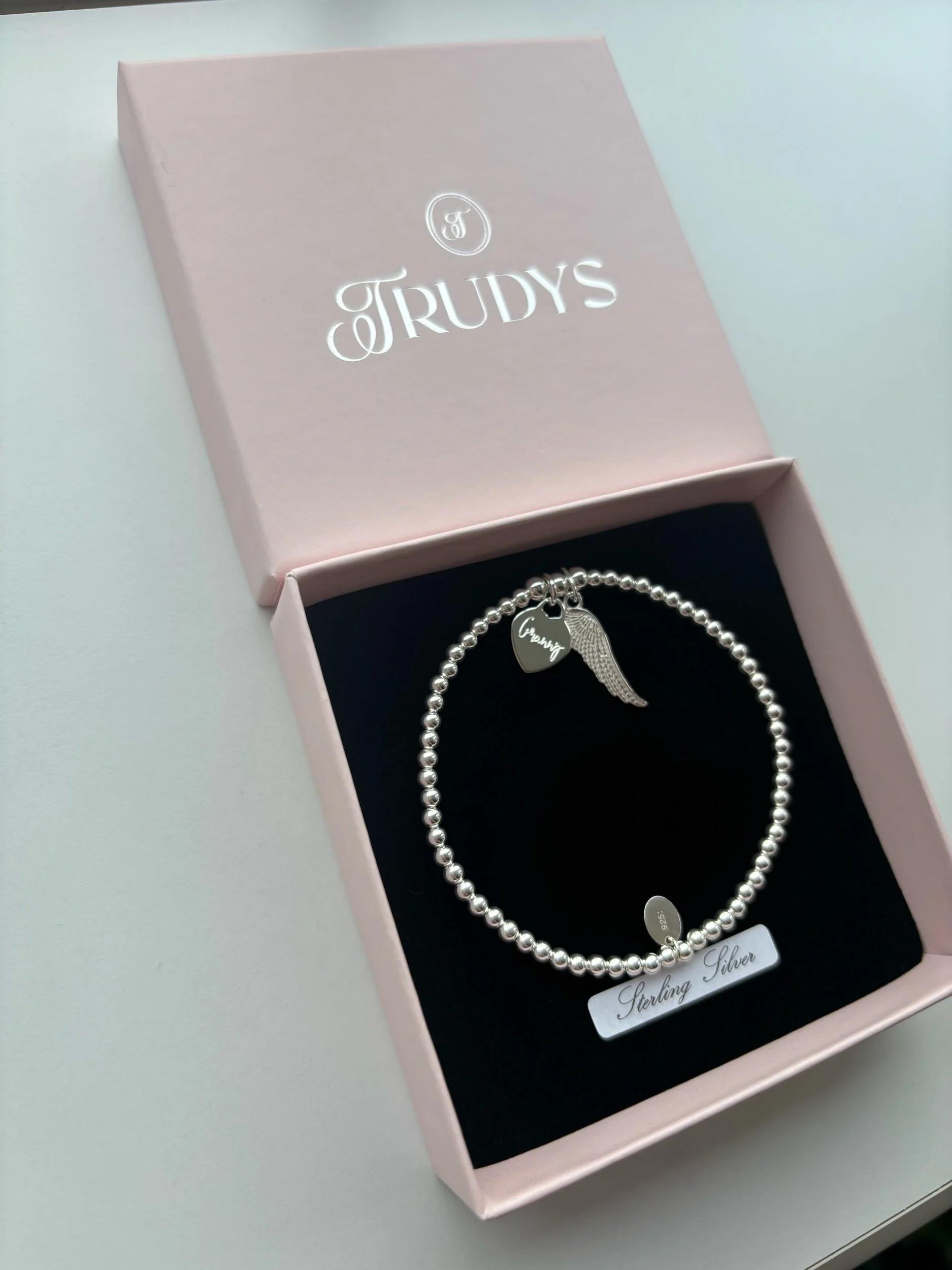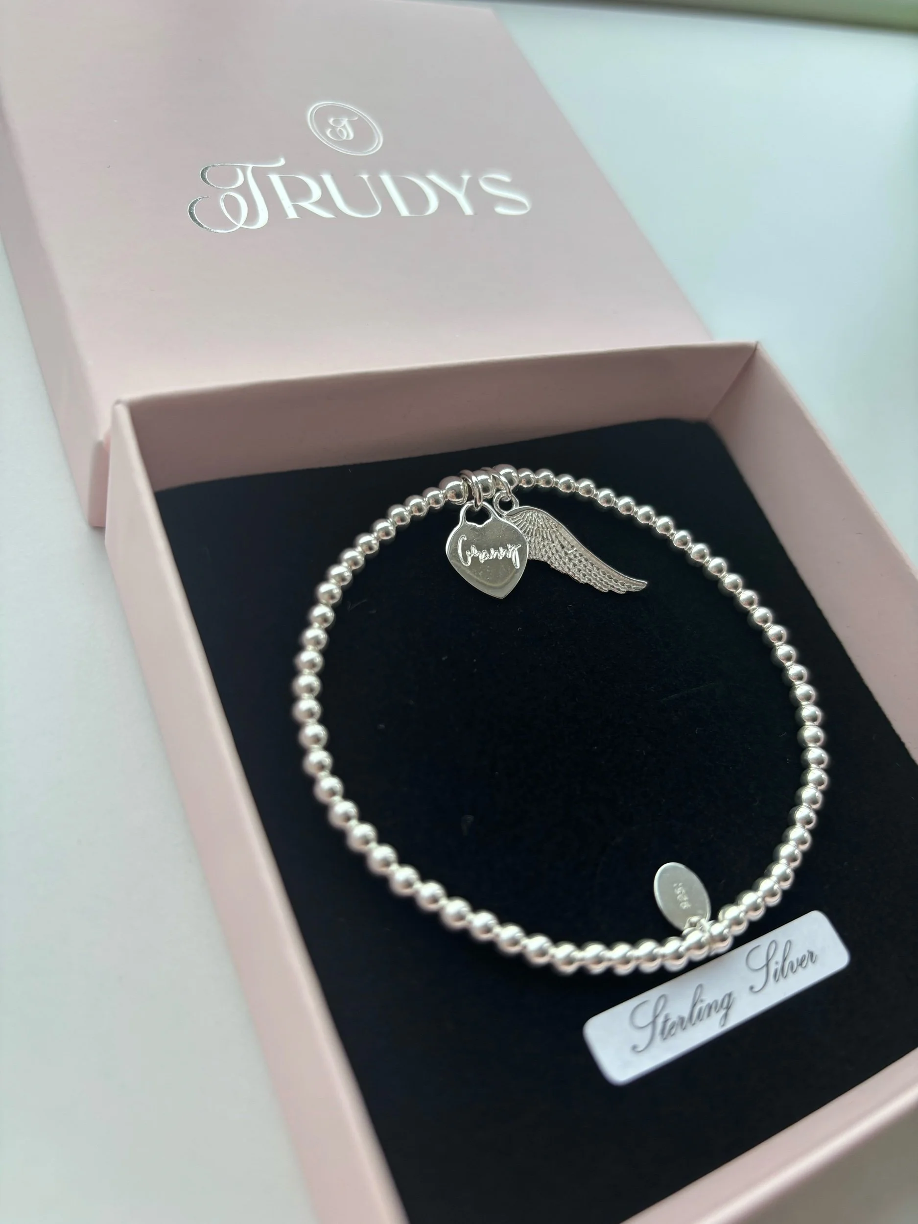 The elegant sterling silver bead bracelet is designed for everyday wear and finished with a heart charm that can be engraved for a personal touch, making it a truly special keepsake.